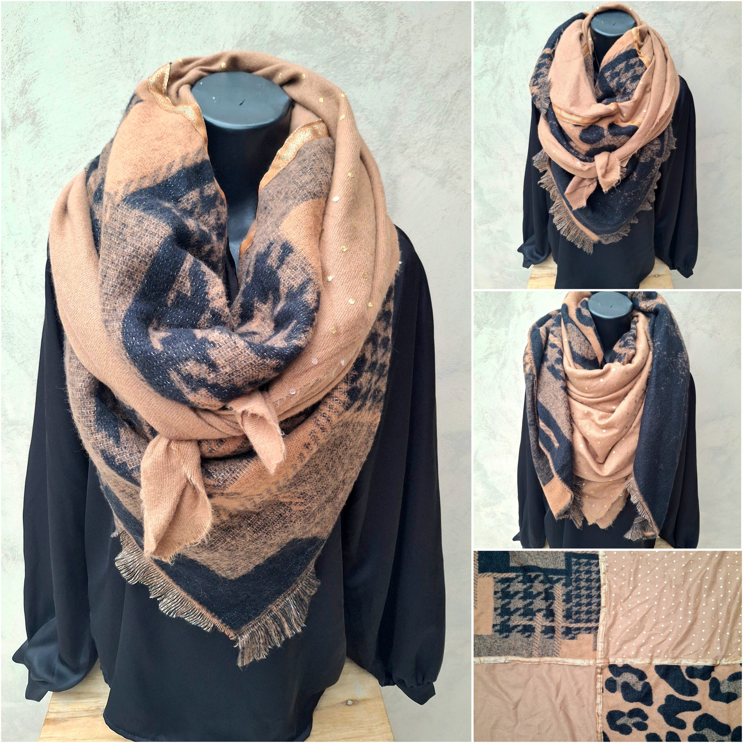 Echarpe carrée 4 tissus pieds de poule et léopard