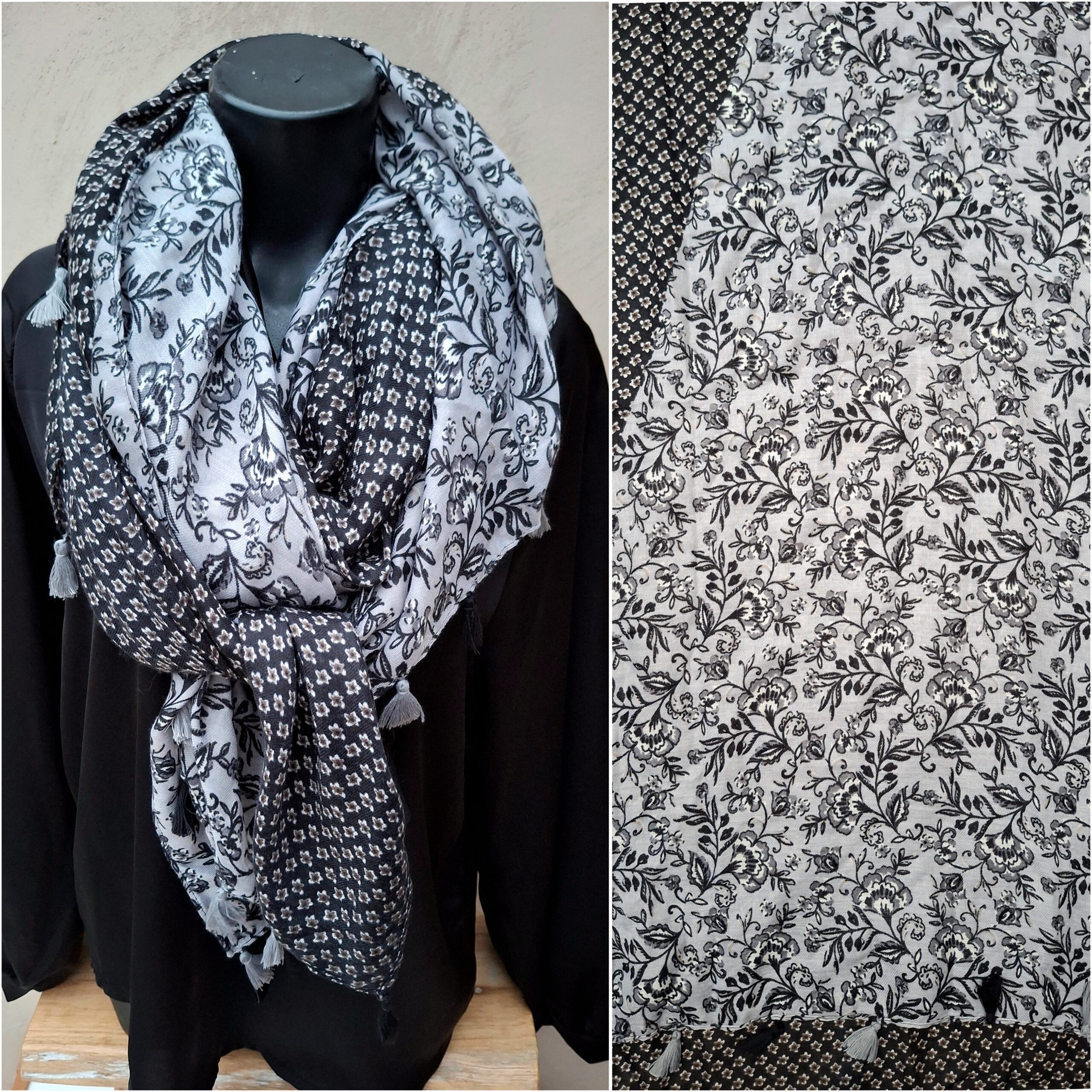 Foulard fleuri deux motifs gris et noir.