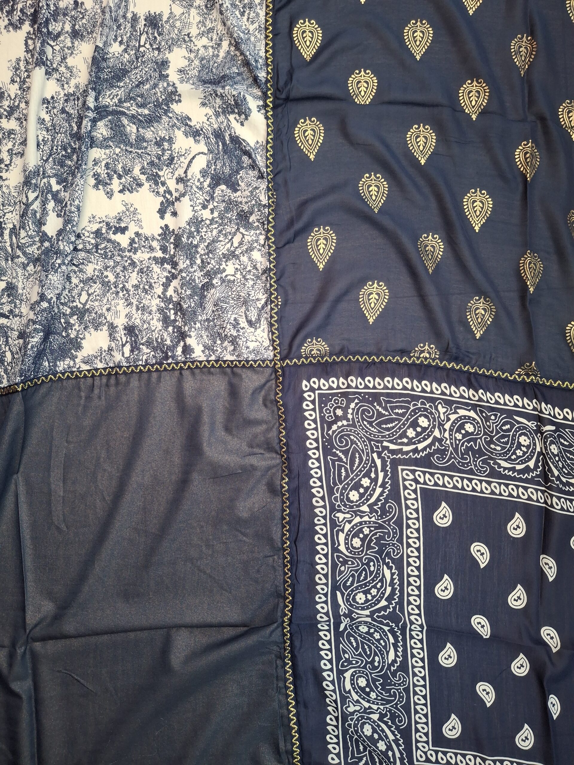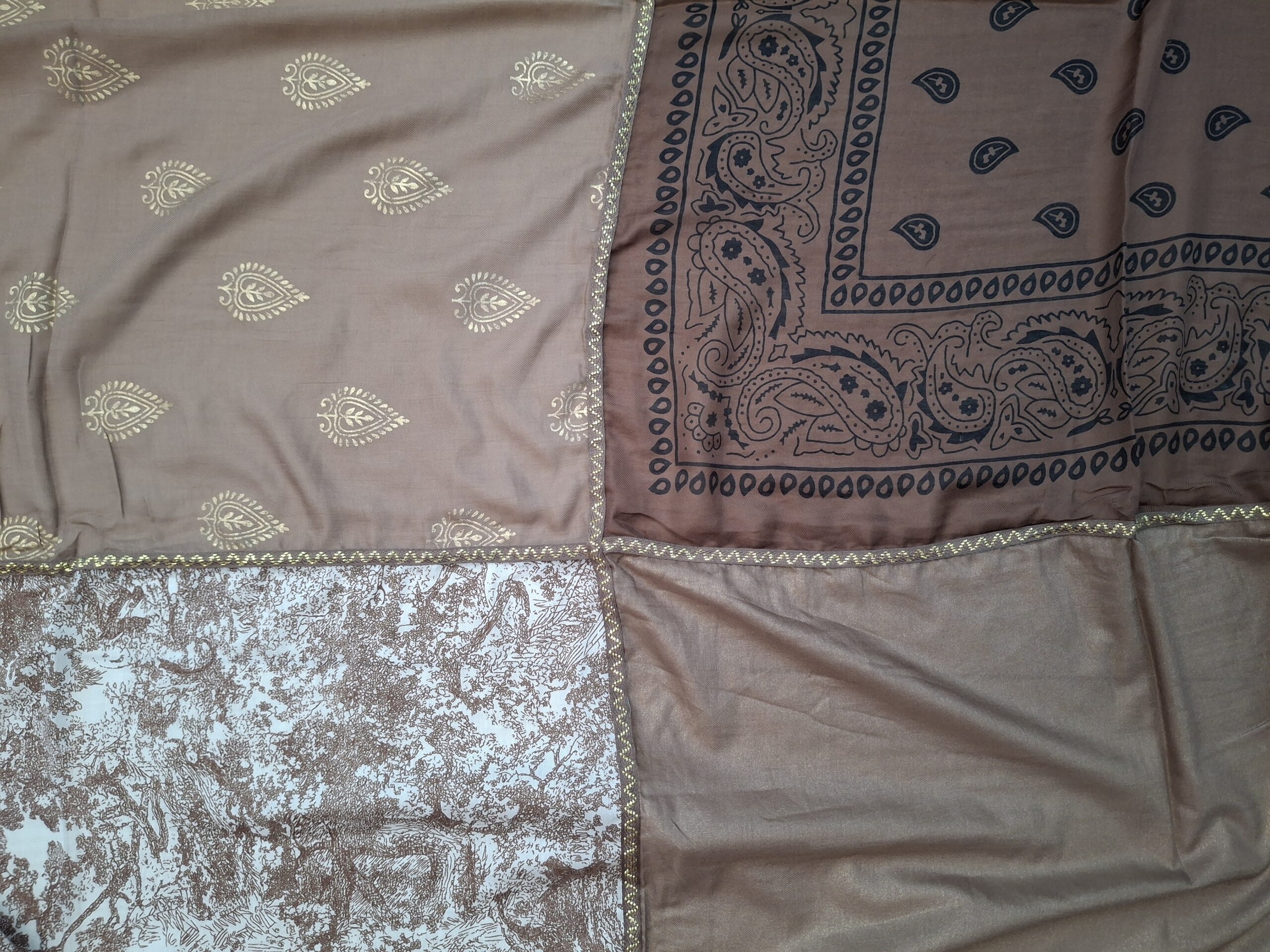 Un tissu bandana, un tissu savane, un tissu uni légèrement brillant et un tissu feuilles dorées.