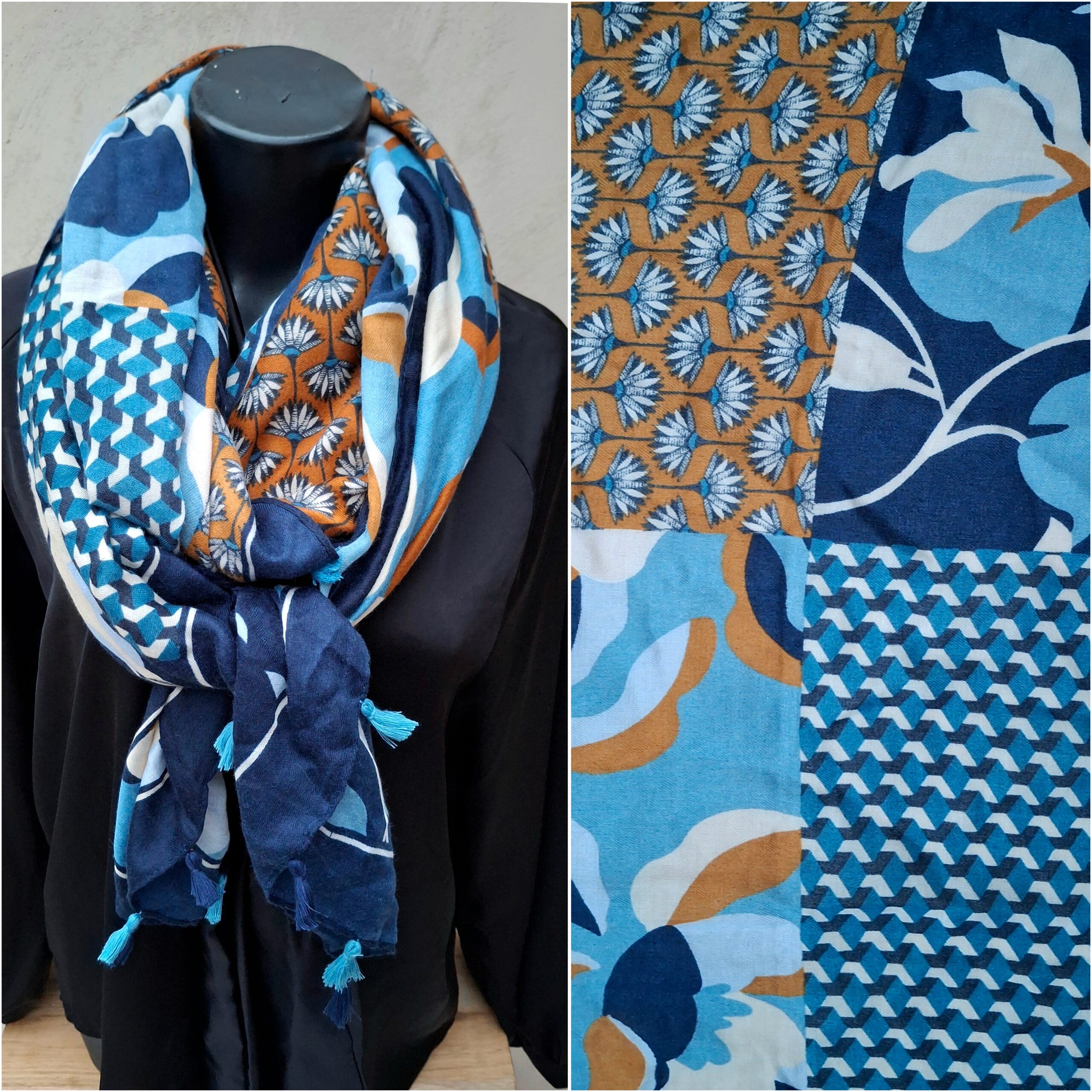 Foulard rectangle bleu et jaune quatre motifs (fleuris et motifs géométriques).