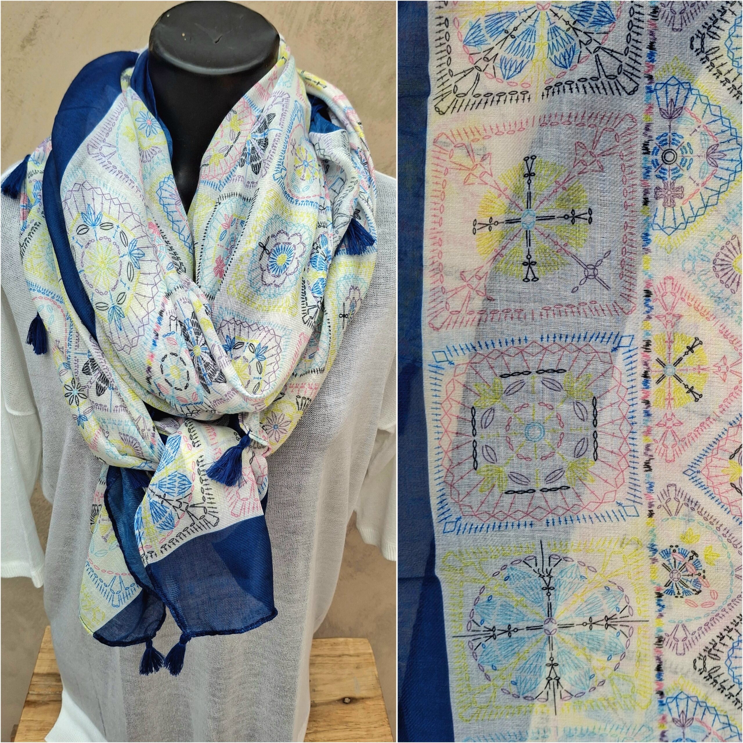 Foulard coloré: vert, mauve, rose, orange, blanc. Motifs style mandalas. Bords bleus et floches bleues.