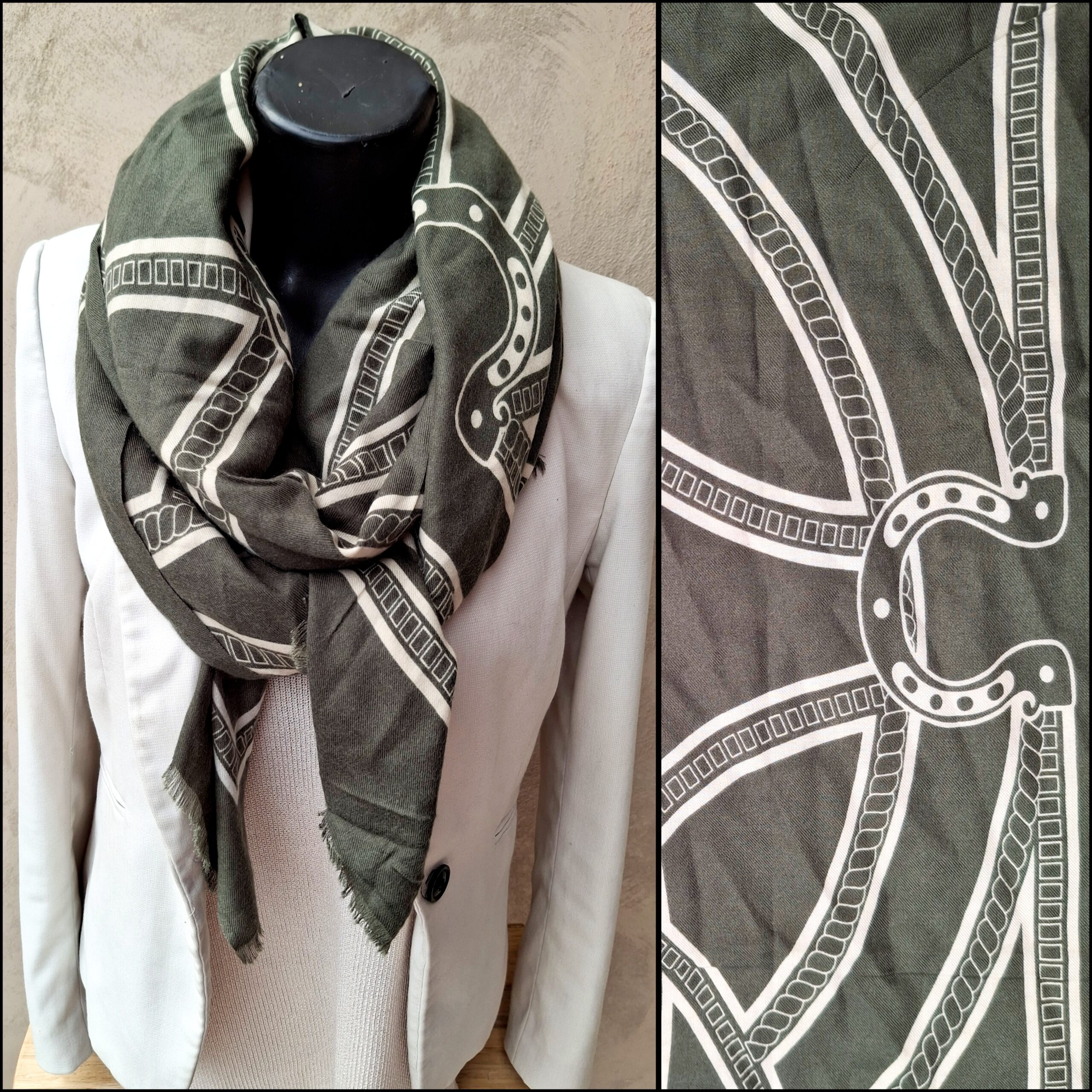 Foulard rectangle épais kaki et beige.