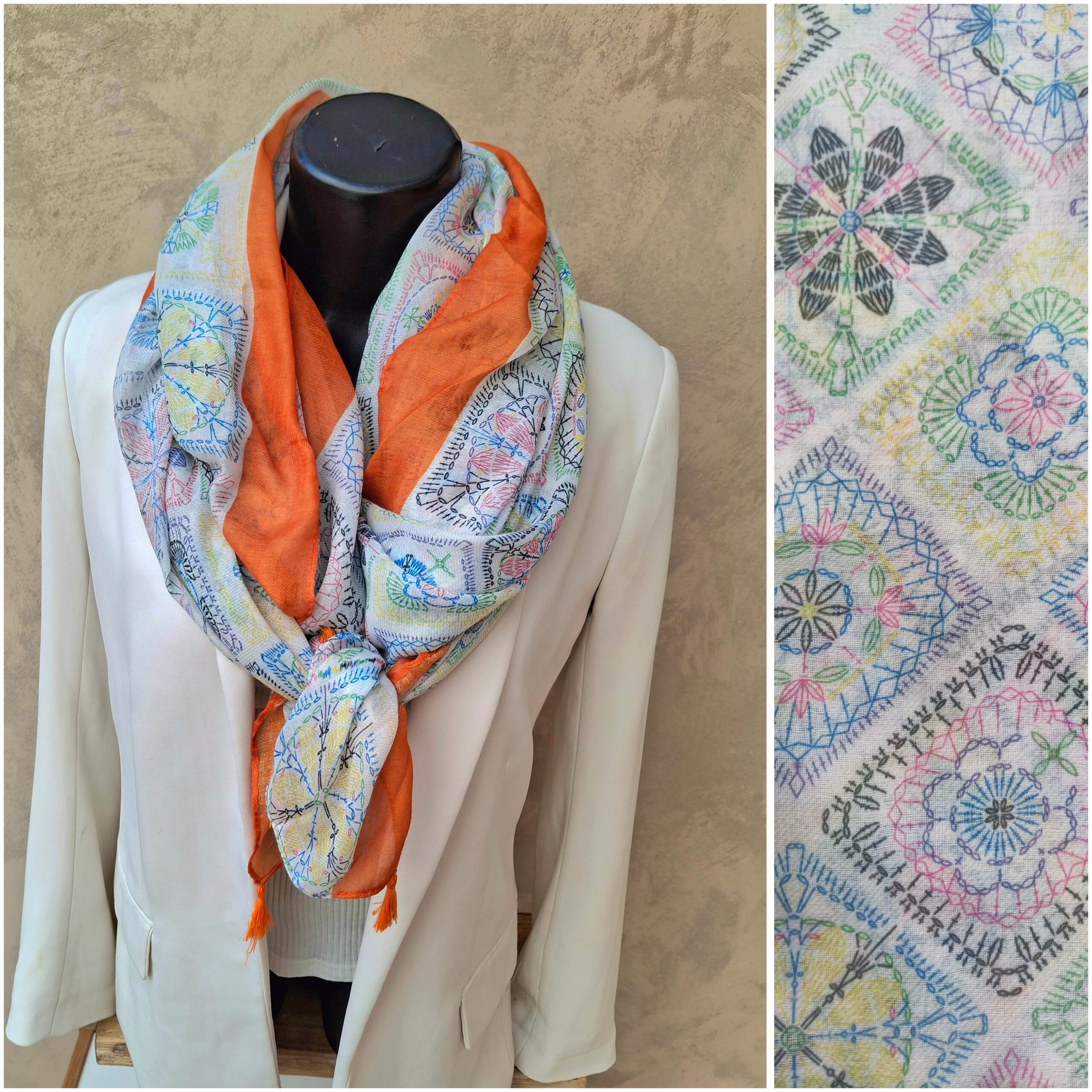 Foulard coloré: vert, mauve, rose, orange, blanc. Motifs style mandalas. Bords et floches oranges.