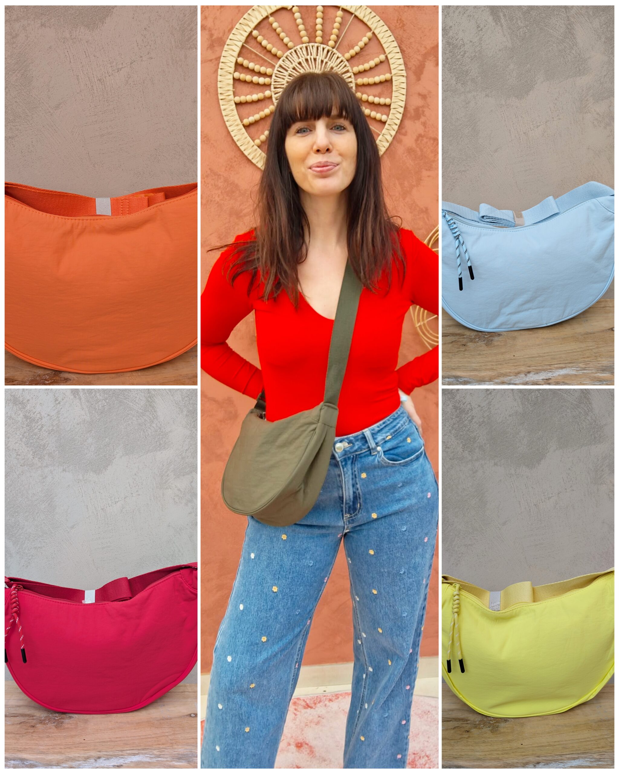 Disponible en bleu ciel, jaune, kaki, orange et rouge.