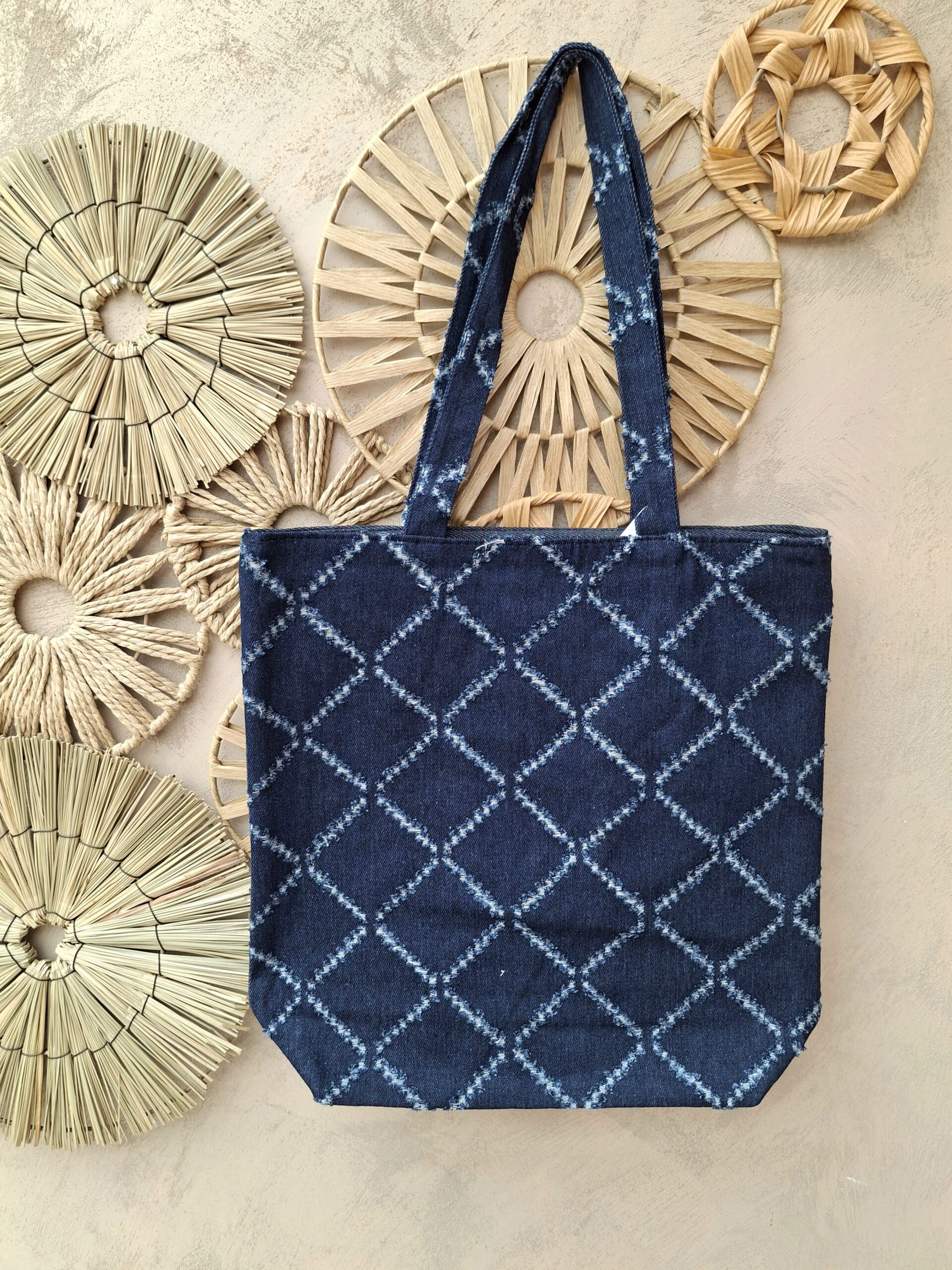 Sac souple en jeans bleu foncé avec fermeture éclair. Parfait pour la plage, les courses, le marché, les vacances, l’école, …